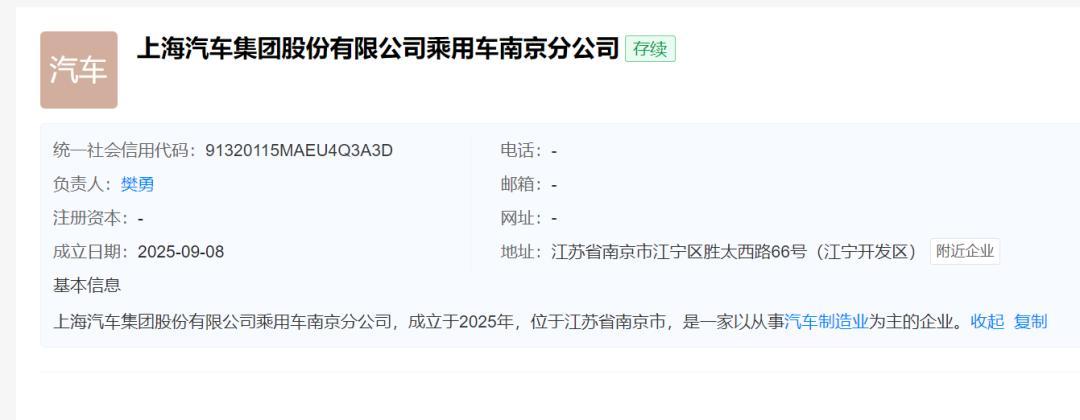 天眼查信息显示,上海汽车集团股份有限公司乘用车南京分公司(下称上汽乘用车南京分公司)于2025年9月8日才成立,设立母公司为上海汽车集团股份有限公司,也就是上市公司上汽集团(600104)。